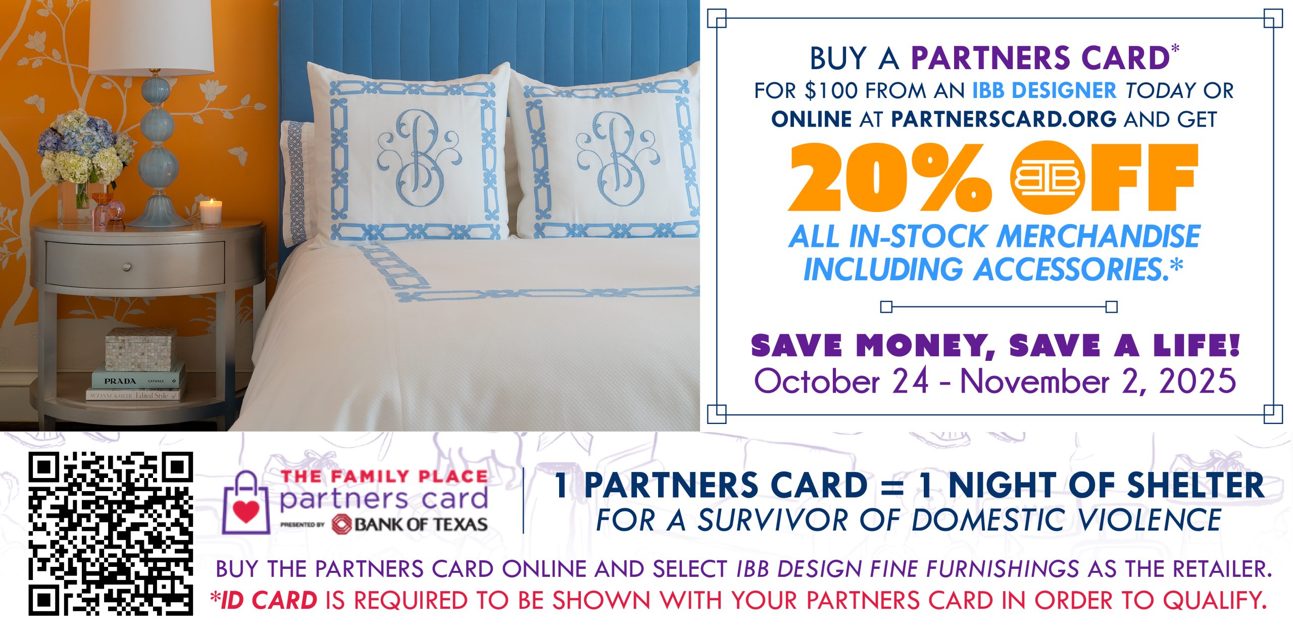 PARTNERS CARDS ARE AVAILABLE FOR PURCHASE AT IBB DESIGN FOR $100 NOW. 100% OF THE PARTNERS CARD SALES GO DIRECTLY TO THE FAMILY PLACE TO SUPPORT SURVIVORS OF FAMILY VIOLENCE. The Partners Card is good for discounts at over 750+ North Texas retailers and restaurants!